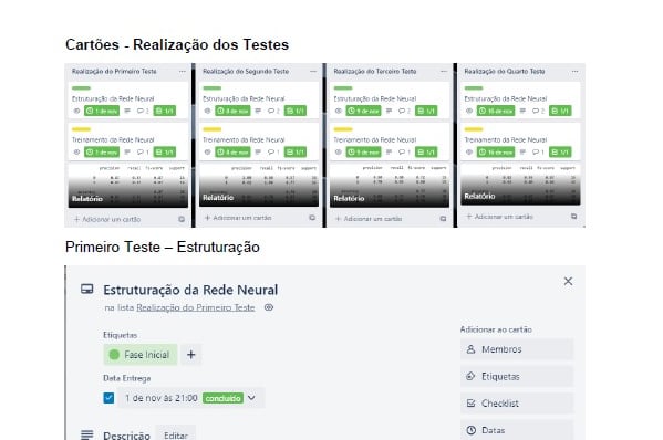 A documentação da Rede Neural inclui o uso do Trello para gerenciar e acompanhar o progresso do projeto. Ela abrange desde a definição do tema e ferramentas utilizadas até os testes e relatórios finais. A documentação detalha cada fase do desenvolvimento, incluindo a importação de bibliotecas, organização estrutural e os resultados dos testes realizados, oferecendo uma visão clara e estruturada do projeto.